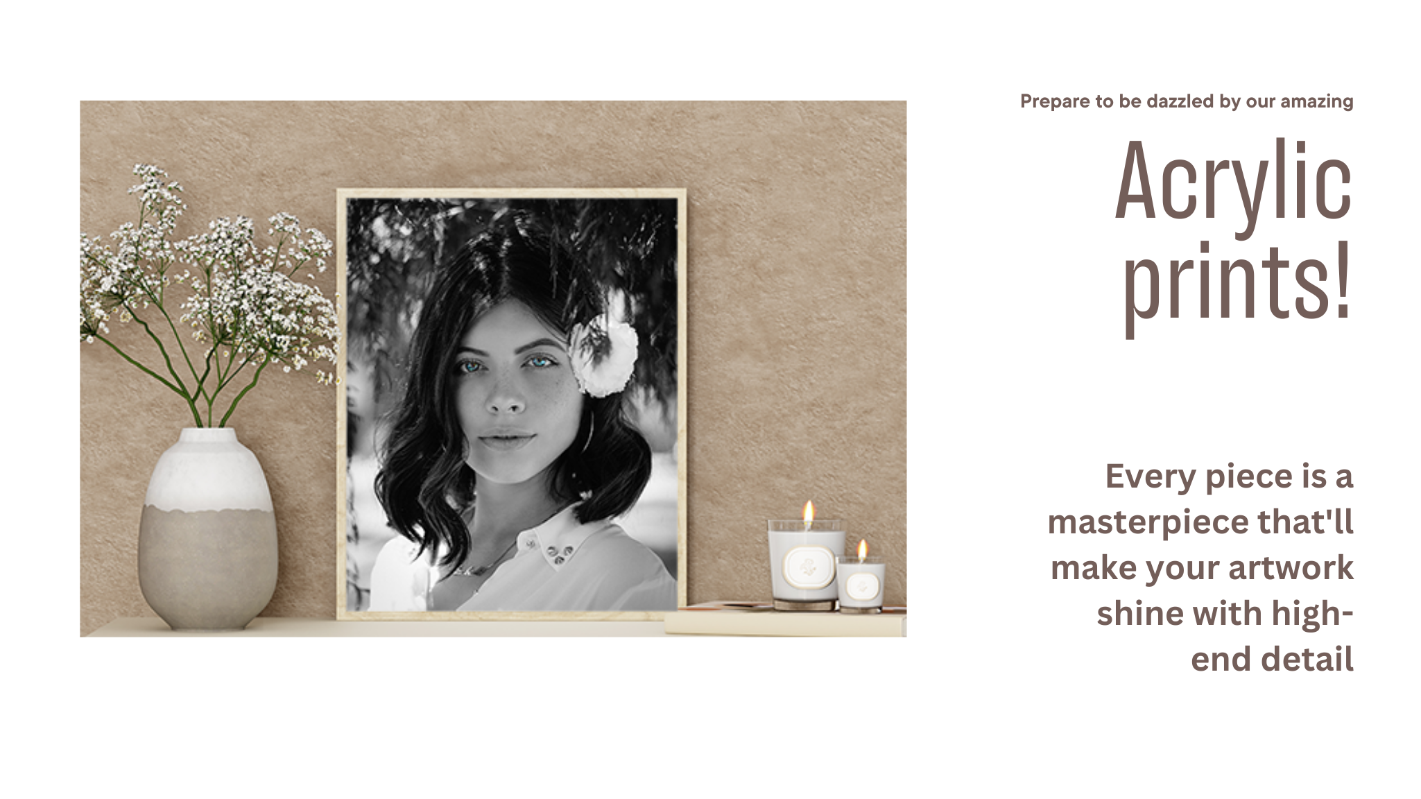 like your photos or art is printed on a glass surface, these acrylic photo prints never fail to dazzle. Your images are second-surface printed directly on a 1/4" acrylic panel for a stunning result. Each acrylic print comes ready to hang, and floats 1.5" off the wall.