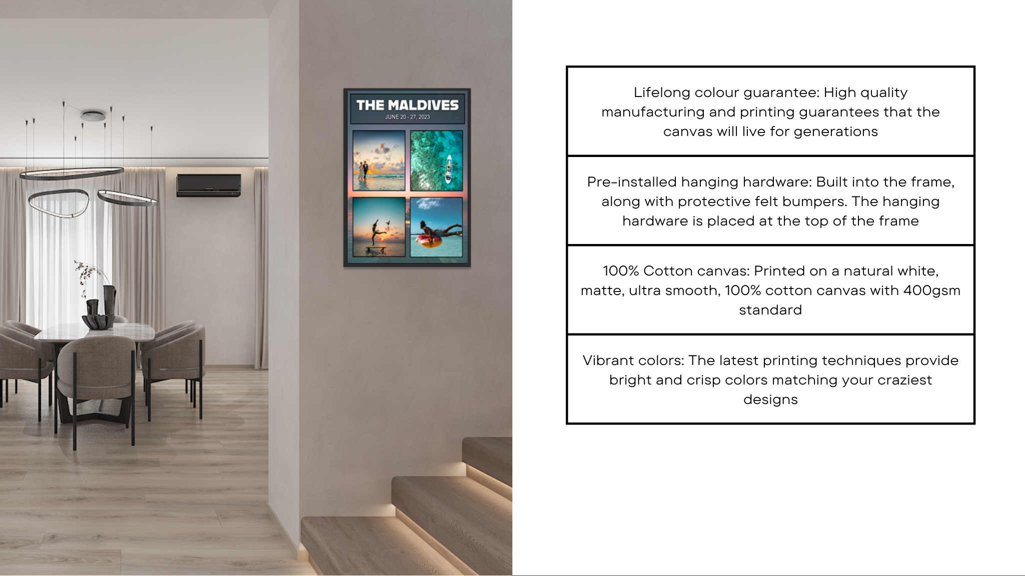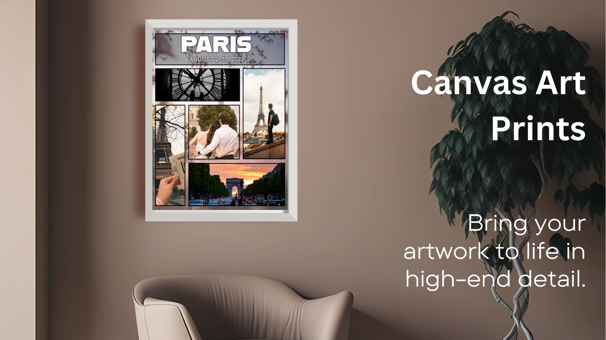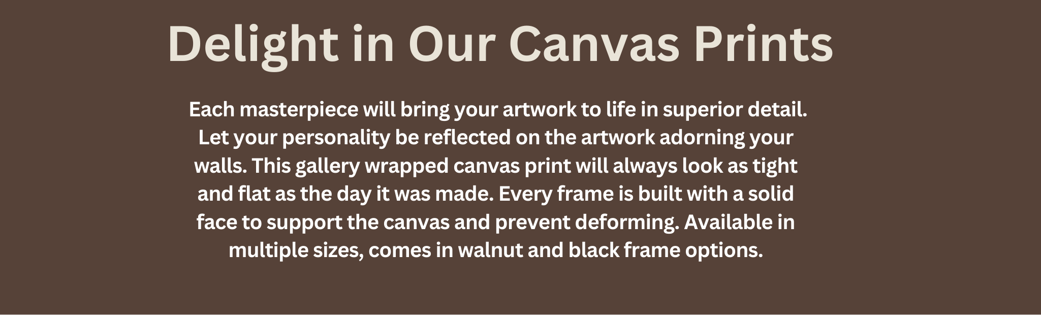 You can choose to add a frame to your personalized canvas prints. The wrapped canvas fits comfortably inside the frame, with the floating frame's edge positioned above the canvas. This elegant enhancement adds a depth of 1.75” to your print.