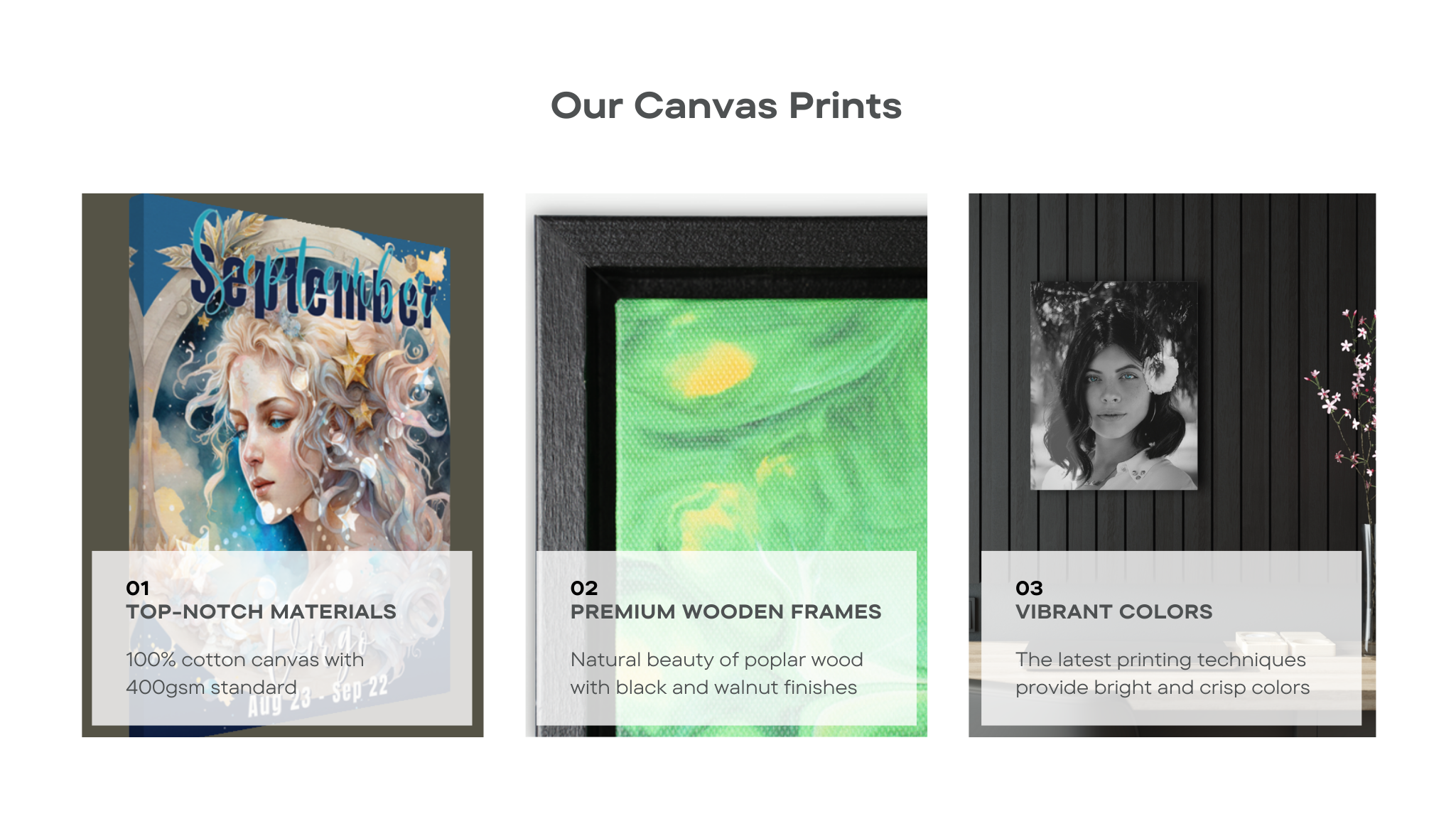 We use 100% cotton canvas. Your artwork is printed on a natural white, matte, ultra smooth, 100% cotton canvas with 400gsm standard