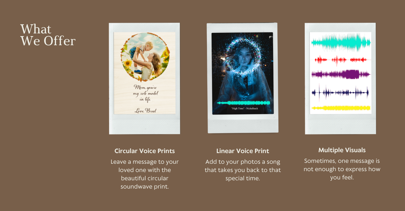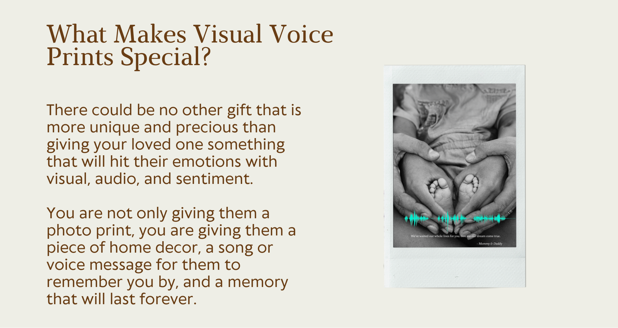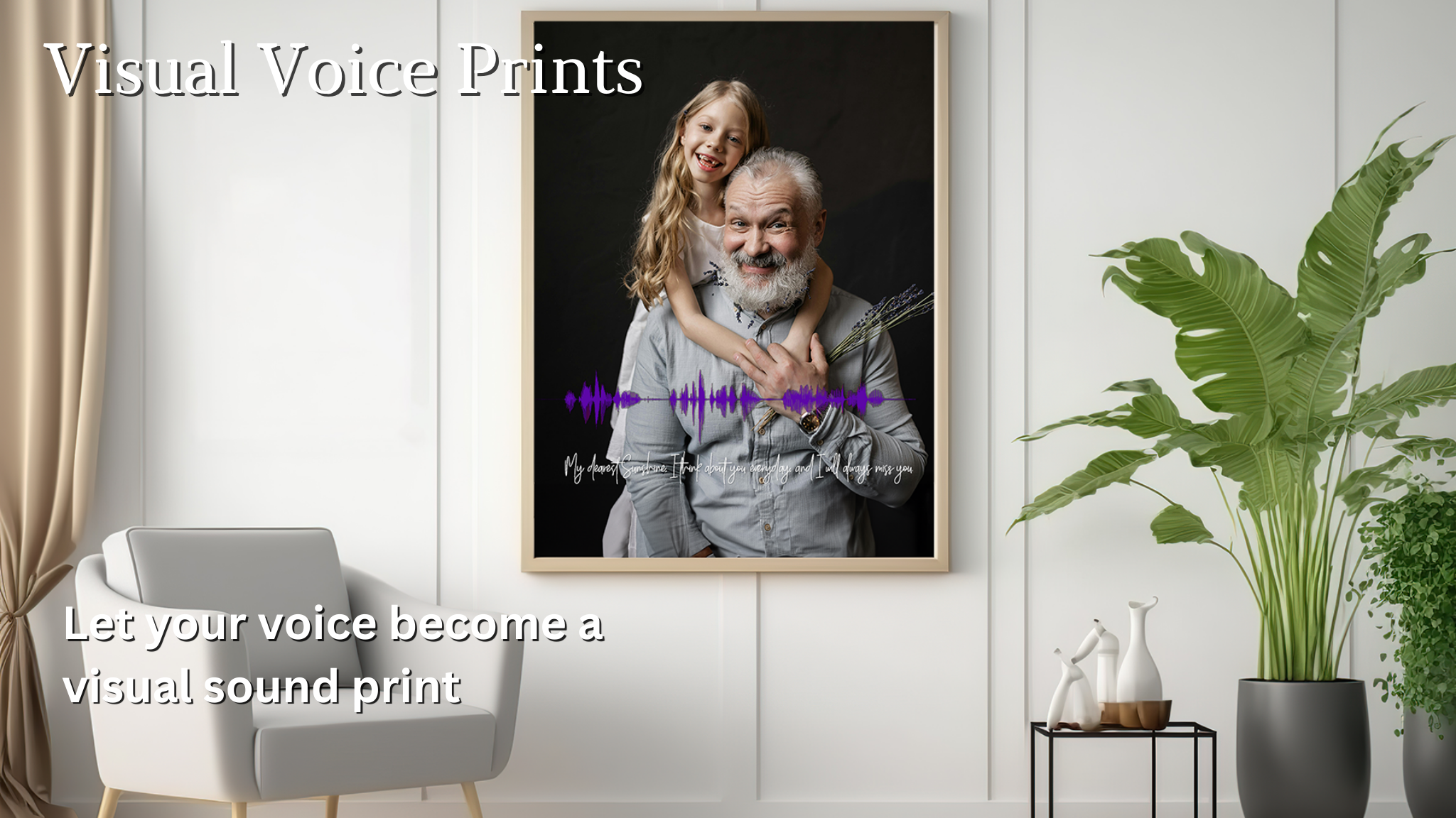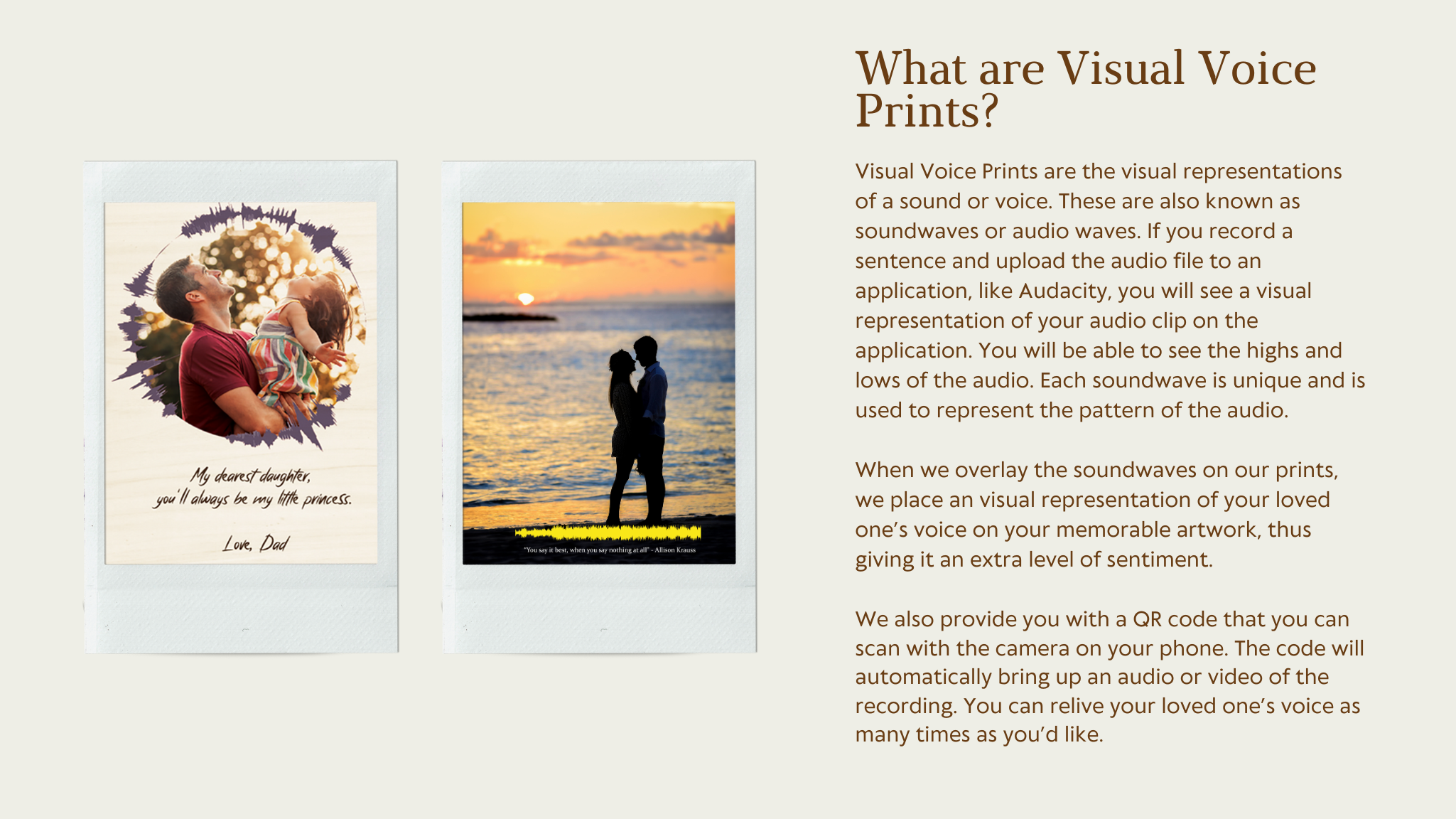 A voiceprint consists of measurable features of a human voice, also known as a soundwave, that uniquely identify a person. When we transform your voice into visual artwork, we create what we call a Visual Voice Print.