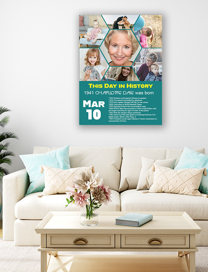 🎉 Commemorate the Birthday of your loved one in Style: Elevate the joy of their special day with our exclusive "This Day in History" customizable art prints! Crafted to honor the uniqueness of their birth, each print features a personalized collage of cherished birthday memories, alongside a curated list of significant historical events that unfolded on the very day they were born.